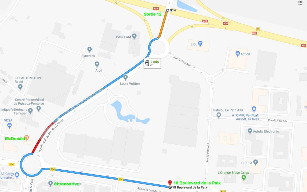 A partir de la sortie 12 de la N14/A15, prendre la direction du McDonald puis au rond point prendre la D14 (Boulevard de la Paix) en laissant le Chronodrive sur la droite.